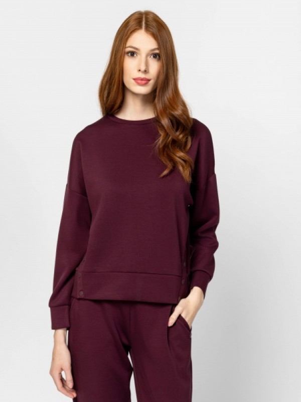 Női pulóver, bővebb szabással, kerek nyakkal, ejtett vállal, saját anyagából készült aljjal és kézelővel, könnyen kezelhető anyagból, logózott patentokkal az elején, kis nyomott márkajelzéssel a hátán. Anyaga: 56% modal, 38% poliészter, 6% elasztán. A modell 175 cm magas és S-es méretet visel