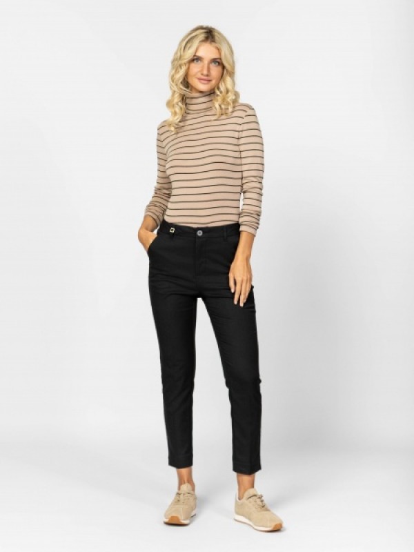 Női hosszú nadrág, slim fit szabással, él vasalással, cipzáros záródással, elején svéd zsebbel, hátsó zsebbel, elasztikus anyagból, alap színekben és trendi kockás mintával, kis fém márkajelzéssel az elején, kis szövött márkajelzéssel a hátsó zseben. Anyaga: 60% poliészter, 35% viszkóz, 5% elasztán. A modell 175 cm magas és 27-es méretet visel. Az öv nem tartozéka a nadrágnak