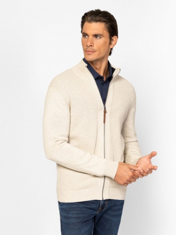 Férfi cipzáros, kötött kardigán, alap színekben, klasszikus szabással, tiszta pamut anyagból, bordázott kötésű gallérral, kézelővel és aljjal, kis fém és bőr márkajelzéssel az eleje alján. Anyaga: 100% pamut, kötött anyag. A modell 188 cm magas és L-es méretet visel