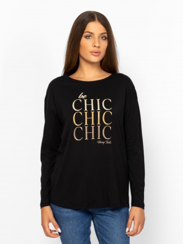 Női hosszú ujjú póló, bővebb szabással, ejtett vállal, kerek nyakkal, modállal kevert pamut anyagból, elején nyomott és kövekből kirakott dekorációval, hátán kis fém márkajelzéssel. Anyaga: 50% pamut, 50% modál single jersey. A modell 175 cm magas és S-es méretet visel
