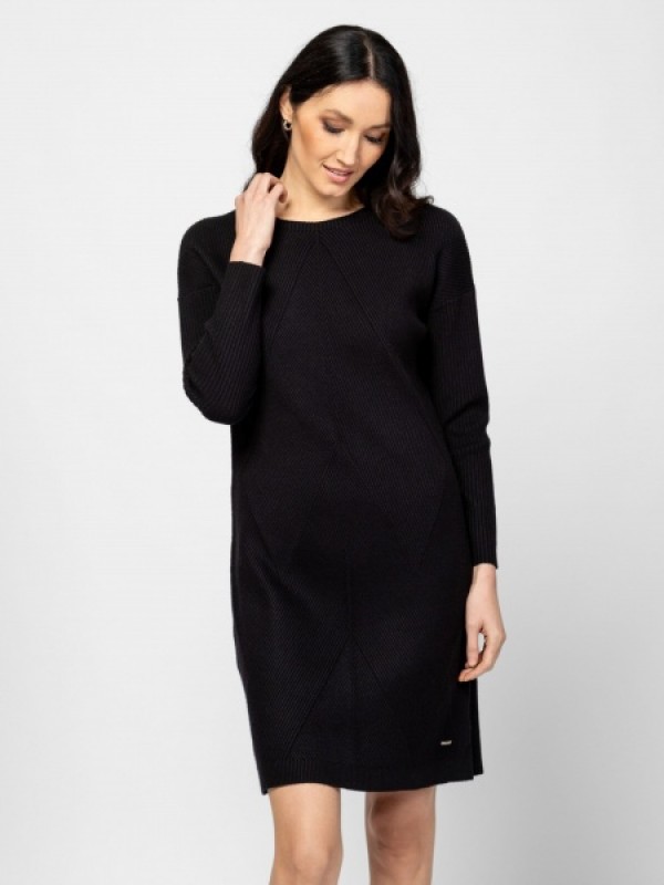 Női bordás kötött ruha, izgalmas mintázattal, egyenes szabással, ejtett vállal, térdig érő hosszal, kerek nyakkal, eleje alján kis fém márkajelzéssel. Anyaga: 49% viszkóz, 28% poliészter, 23% nylon, kötött anyag. A modell 175 cm magas és S-es méretet visel