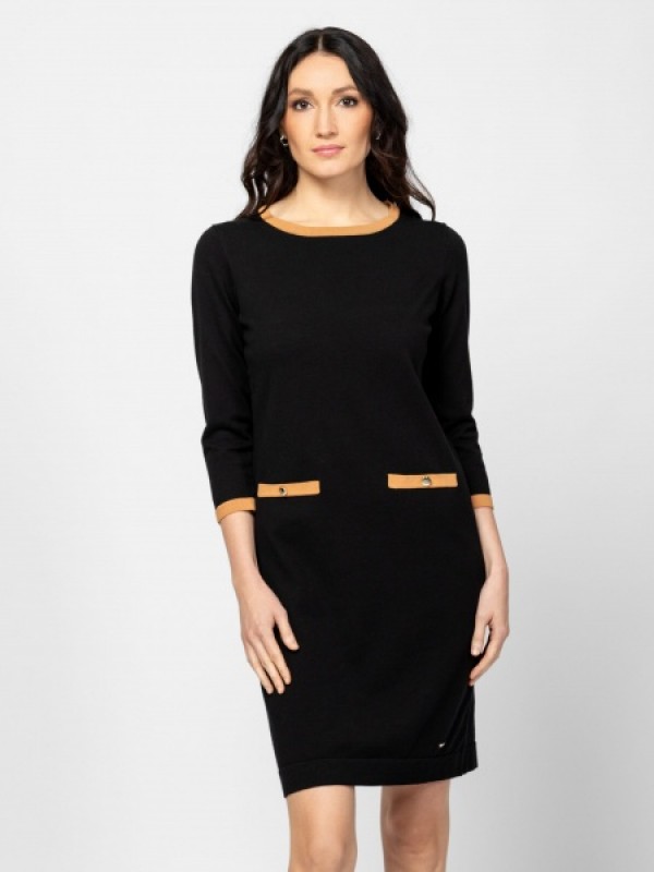 Női kötött ruha, nőies vonalvezetéssel, térd fölött érő hosszal, kerek nyakkal, izgalmas csíkozással,elején díszgombos álzsebbel, kis fém márkajelzéssel az eleje alján. Anyaga: 65% pamut, 35% poliamid, kötött anyag. A modell 175 cm magas és S-es méretet visel.