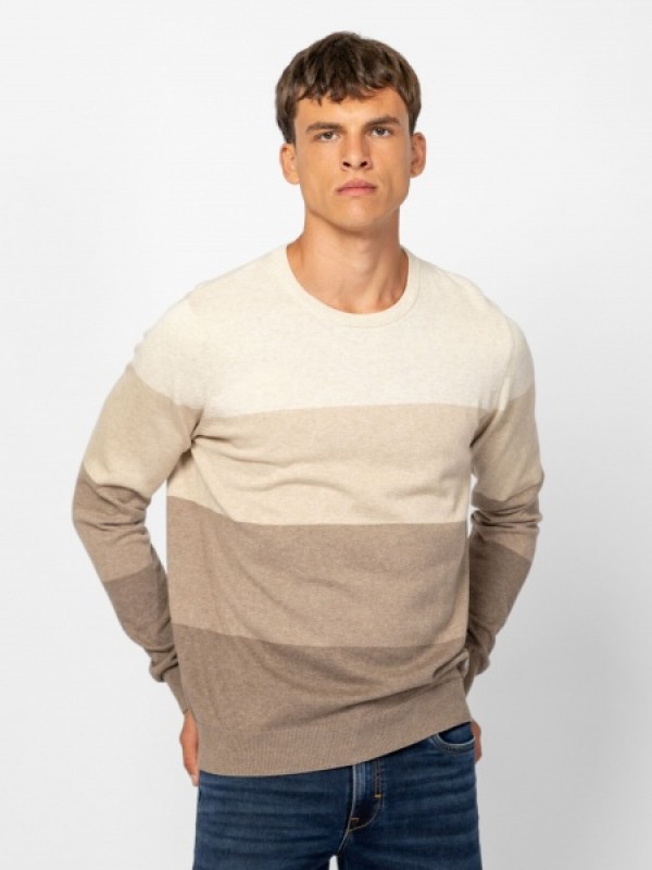 Férfi finom kötött pulóver, klasszikus szabással, széles csíkozással, kerek nyakkal, bordás kötött kézelővel, nyakkal és aljjal, kis szövött márkajelzéssel az eleje alján. Anyaga: 100% pamut, kötött anyag. A modell 188 cm magas és L-es méretet visel