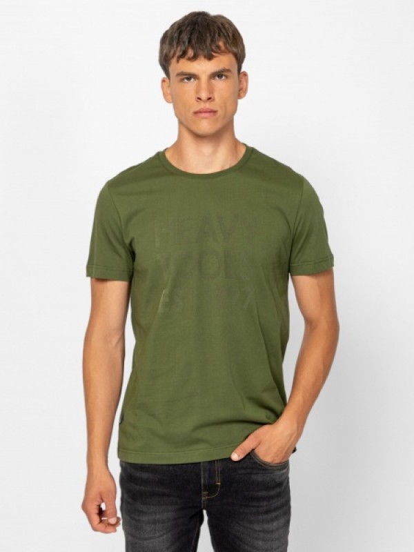 Férfi rövid ujjú póló, egyenes szabással, kerek nyakkal, elején nagy applikált, hímzett márkajelzéssel, oldalában szövött címkével. Anyaga: 100% pamut, single jersey. A modell 188 cm magas és L-es méretet visel