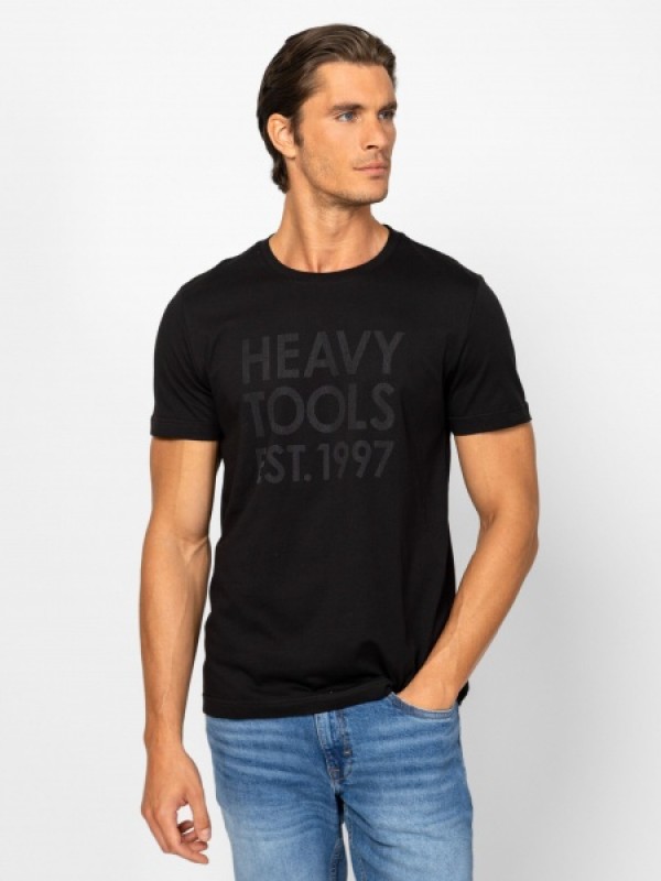 Férfi rövid ujjú póló, egyenes szabással, kerek nyakkal, elején nagy applikált, hímzett márkajelzéssel, oldalában szövött címkével. Anyaga: 100% pamut, single jersey. A modell 188 cm magas és L-es méretet visel