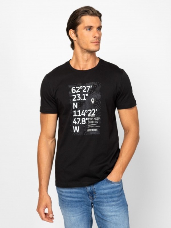 Férfi rövid ujjú póló, egyenes szabással, kerek nyakkal, elején nagy nyomott dekorációval és márkajelzéssel, oldalában szövött címkével. Anyaga: 100% pamut, single jersey. A modell 188 cm magas és L-es méretet visel