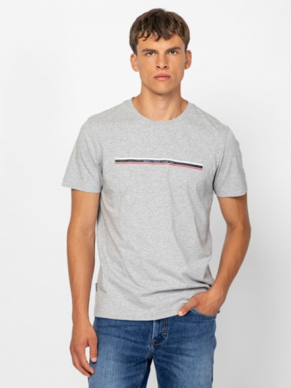 Férfi rövid ujjú póló, egyenes szabással, kerek nyakkal, elején nagy applikált márkajelzéssel, oldalában szövött címkével. Anyaga: 100% pamut, single jersey. A modell 188 cm magas és L-es méretet visel