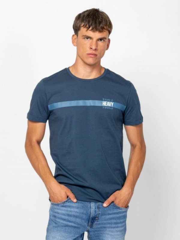 Férfi rövid ujjú póló, egyenes szabással, kerek nyakkal, elején nagy applikált márkajelzéssel, oldalában szövött címkével. Anyaga: 100% pamut, single jersey. A modell 188 cm magas és L-es méretet visel