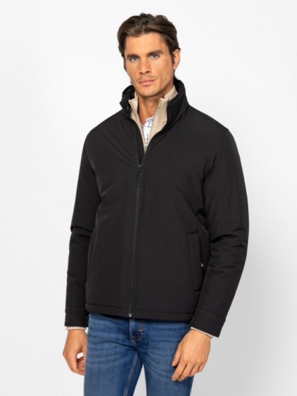 Férfi dzseki, klasszikus színekben, rövid állású, kényelmes fazonnal, cipzáras záródással, állítható aljjal, patentos kézelővel. Elején cipzáros zsebekkel, belső zsebbekkel, ujján kis fém márkajelzéssel. Anyaga: külső: 100% poliészter, bélés: 100% poliészter, tömés: 100% poliészter. A modell 188 cm magas és L-es méretet visel