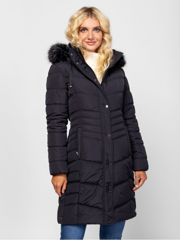 Női utcai steppelt télikabát, nőies vonalvezetéssel, térdig érő hosszal, külső szélfogóval, állítható és levehető kapucnival, kapucniról levehető szőrmével, rövid műszőrmével bélelt gallérral, szabásvonalba helyezett cipzáros zsebekkel, oldalában patentos hasítékkal, kis fém márkajelzéssel az ujján és a kapucniján. Anyaga: külső: 100% nylon, bélés: 100% poliészter, tömés: 100% poliészter, műszőrme: 100% poliészter. A modell 175 cm magas és S-es méretet visel