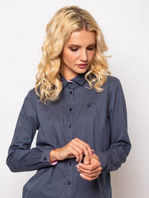 Női ingblúz bővebb szabással, dekoratív gallér megoldással, gombos kézelővel, elasztánnal kevert pamut anyagból, sikkes mintákkal, hímzett márkajelzéssel az elején, kis fém márkajelzéssel a hátán. Anyaga: 97% pamut, 3% elasztán, puplin. A modell 175 cm magas és S-es méretet visel